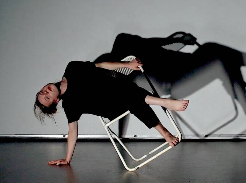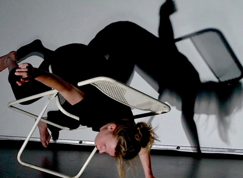 “The Symbiosis” shows an intimate interaction between a dancer and a folding chair. It displays a close physical play, where the dancer not only pushes her own limits but also stretches the qualities of the chair.
